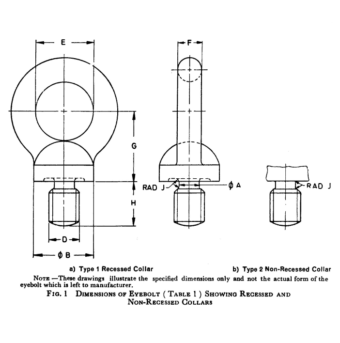 | Thread Size (D) | Max Axial Lifting (WLL) | E Min | A Min | G Max | H Min | F Max | J Min | B Min (Unmachined Collars) | B (Machined Collars) |